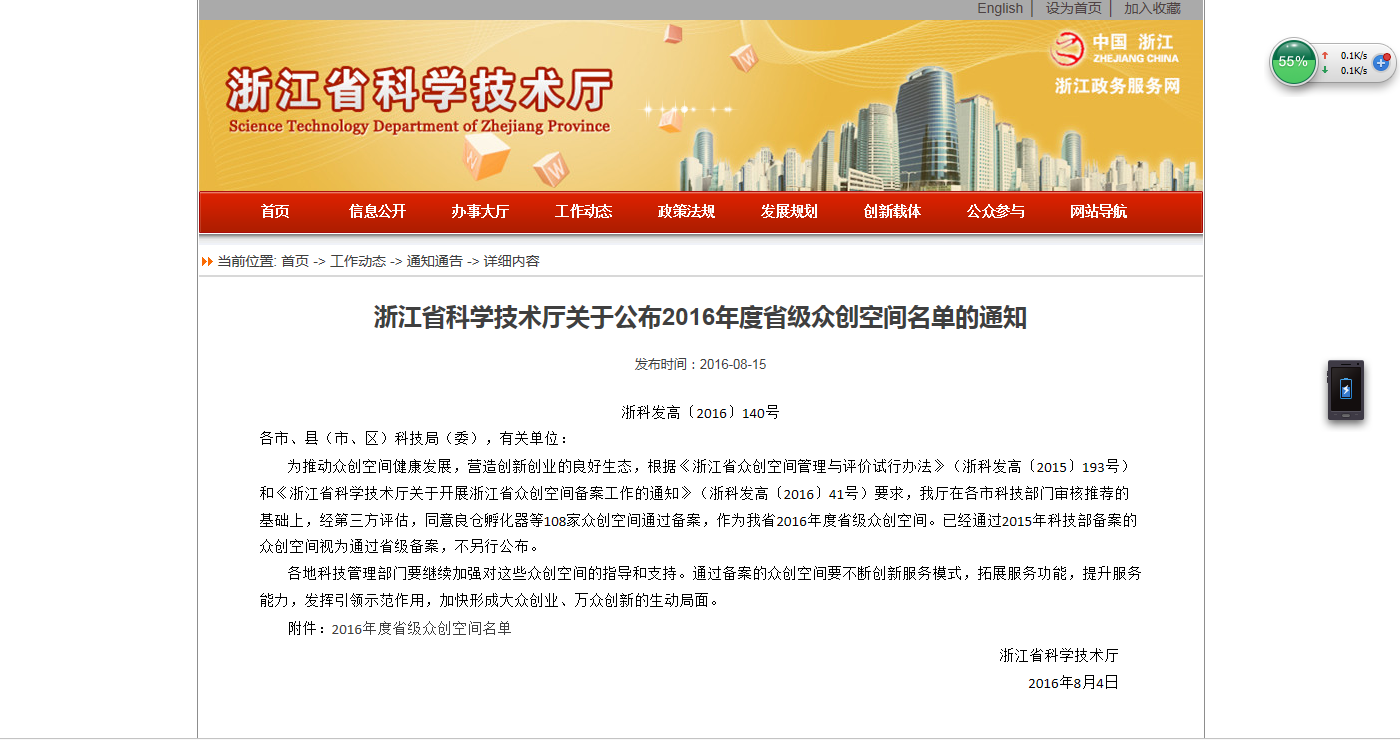 近日,浙江省科技厅公布了2016年省级众创空间名单,公司众创空间顺利通过评估,跻身省级众创空间之列。据了解,这是根据《浙江省众创空间管理与评价试行办法》(浙科发高〔2015〕193号)和《浙江省科学技术厅关于开展浙江省众创空间备案工作的通知》(浙科发高〔2016〕41号)要求,省科技厅在各市科技部门审核推荐的基础上,经第三方评估而评出的。