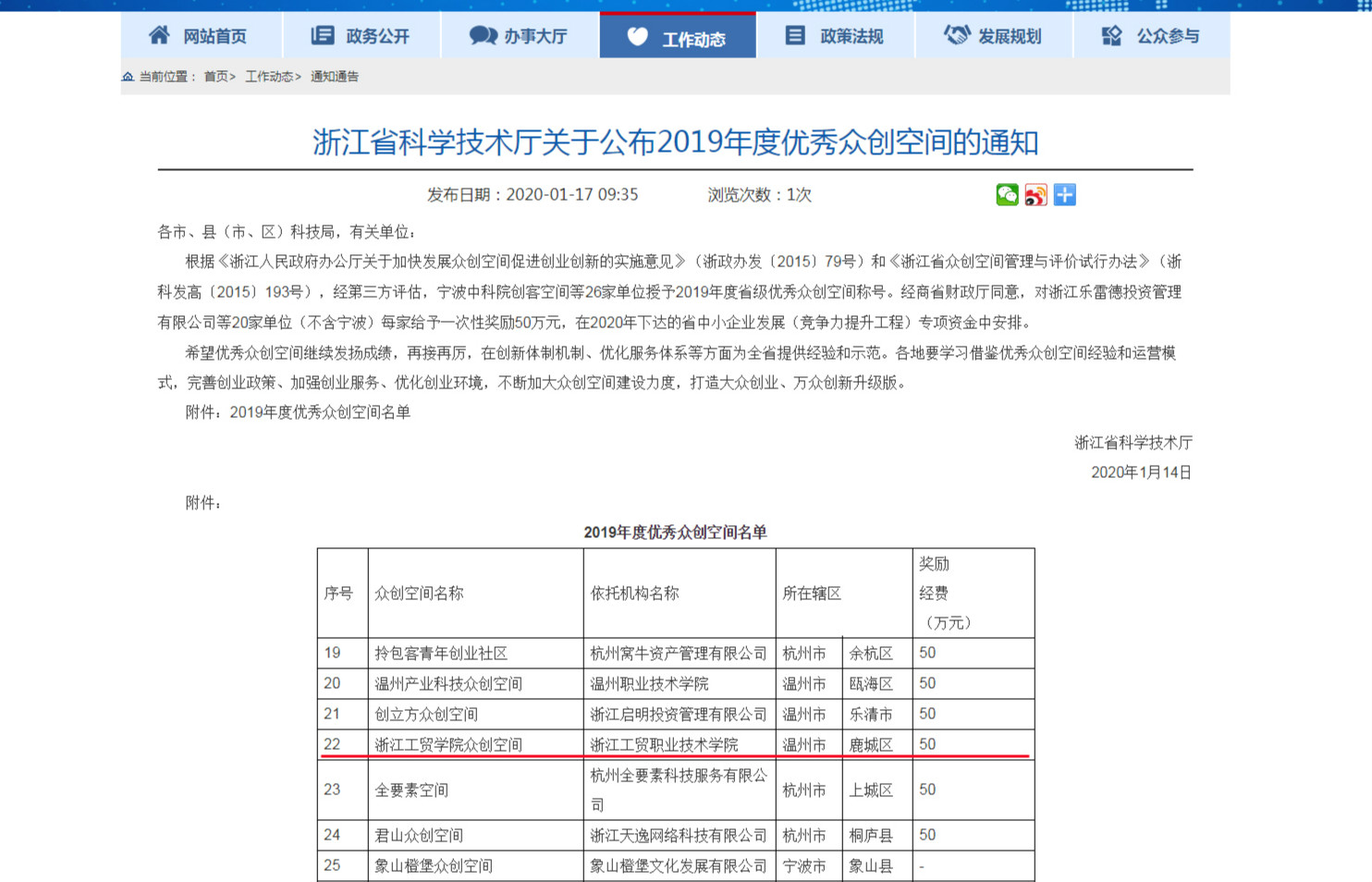根据《浙江人民政府办公厅关于加快发展众创空间促进创业创新的实施意见》(浙政办发〔2015〕79号)和《浙江省众创空间管理与评价试行办法》(浙科发高〔2015〕193号),经第三方评估,公司众创空间被授予2019年度省级优秀众创空间称号,并给予一次性奖励50万元。