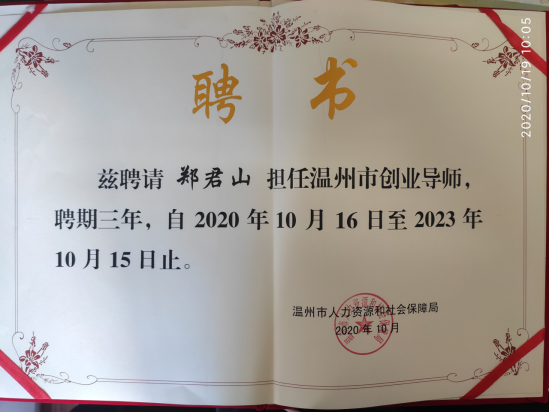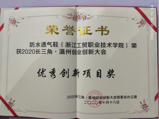 在10月18日举行了闭幕式上,公司“防水透气鞋”项目获得“2020长三角·温州创业创新大会优秀创新项目奖”,郑君山老师被温州市人力与社保局聘为“温州市创业导师”。