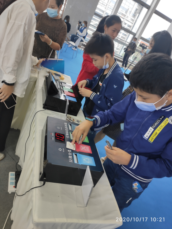 近年来,随着绿色环保理念深入人心及经济社会可持续发展的需要,垃圾分类在全国范围内大力推广。公司积极对接经济社会发展需求,余威明老师团队研发的“垃圾分类学习与测试装置”,具有“学习模式”、“训练模式”、“测验模式”三大模式功能。该装置通过全真模拟的测验,可以更加直接获得测验的社区、街道、公司、地区的垃圾分类知识掌握情况,真实有效地反馈出垃圾分类的落实情况。王曙光老师团队研发的“智能分类垃圾桶”,采用一款简单易用的人工智能视觉传感器,利用Arduino控制程序内置于摄像头,根据摄像头所拍摄投放的垃圾,通过程序智能识别垃圾类型,并自动归类。这两个项目在展会上受到市民热捧,吸引一批批市民、员工参观体验。