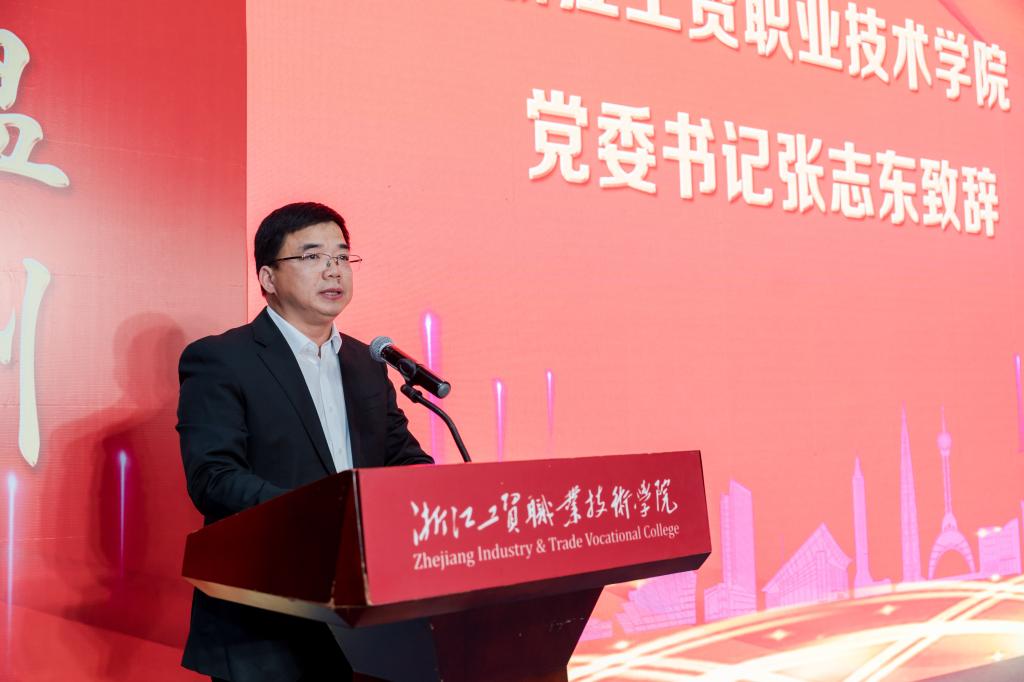 浙江工贸职业技术公司党委书记张志东致辞。张志东书记在致辞中指出,公司扎根温州办学,温州民营经济的活力使公司创新创业的种子拥有了得天独厚的沃土。公司从2000年开始创新创业教育,是全国最早开展双创教育的高职院校,经过一代代“工贸人”的探索实践和持续突破,形成了“学园城融合 研训创融通”的双创育人模式并取得显著成效。工贸公司将鼓足干劲,致力于培养更多的创新创业人才。