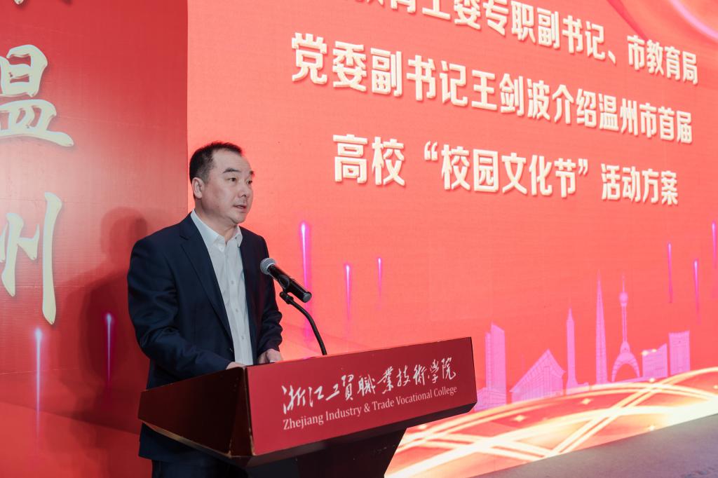 市委教育工委专职副书记、市教育局党委副书记王剑波介绍了温州市首届高校“校园文化节”活动方案。首届高校“校园文化节”包括温州高校十佳“员工社团”评比路演、老员工现场书法大赛、2023级新生“校园十佳歌手”大赛、非遗大师进校园等八大类活动。