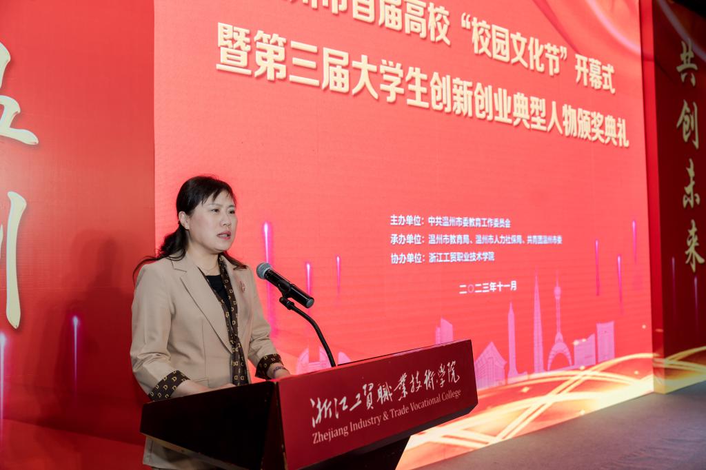 挥洒火热青春,共享老员工活。2023年11月23日下午,温州市首届高校“校园文化节”开幕式暨第三届老员工创新创业典型人物颁奖典礼在公司府东路校区举行。温州市委副书记、市委教育工委书记张加波,市委副秘书长张榜桃,团市委书记张呈念,市委教育工委专职副书记、市教育局党委副书记王剑波,公司党委书记张志东、董事长余闯,市人力社保局副局长王晓康及在温州高校相关领导、创业公司负责人、创新创业典型人物、员工代表共计200余人参加了活动。活动由市委教育工委副书记、市教育局党委书记、局长郑焕东主持。