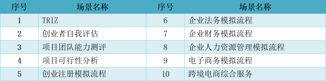 提供交互式体验的十大典型场景,实现双创项目的可行性平台模拟测试、项目团队结构及能力自我评估、模拟跨境电子商务进出口流程等场景(见表4)。