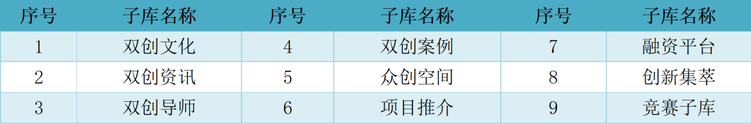 九大特色资源子库培养双创土壤、营造双创文化,满足不同使用用户需求,构建多方交互的双创生态圈(见表3)。