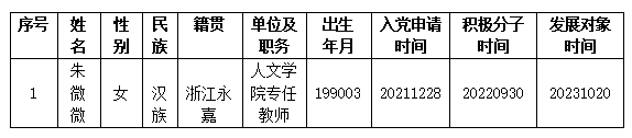 根据《中国共产党发展党员工作细则》有关规定,经中共m88官网人文公司第二支部委员会研究,人文公司党总支同意,拟吸收朱微微同志为中共预备党员。现予以公示,征求党员、群众和部门的意见。公示期限内,个人和部门均可通过来信、来电、来访等形式,向公示对象所属党总支或支部反映情况。公示对象基本信息如下: