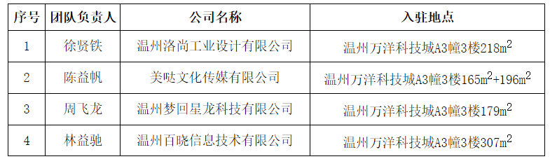 经员工自愿报名、专家评审、公司与温州万洋集团审核,徐贤铁等4支创业团队符合入驻要求,现公示如下:
