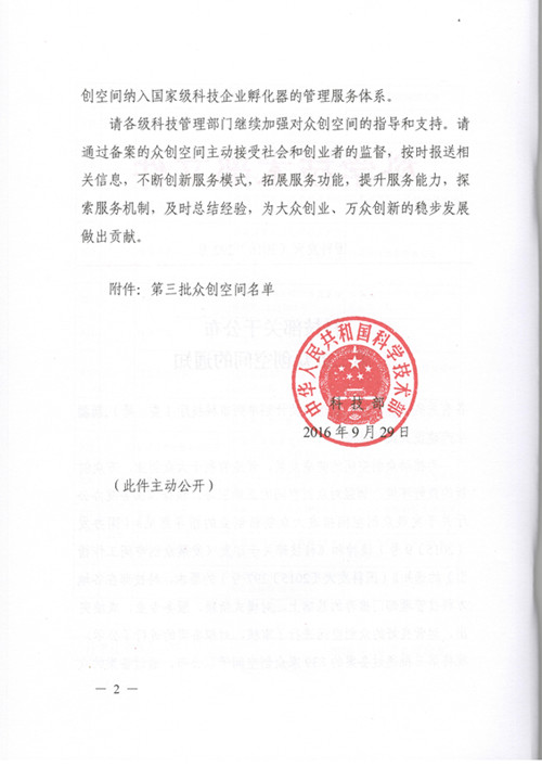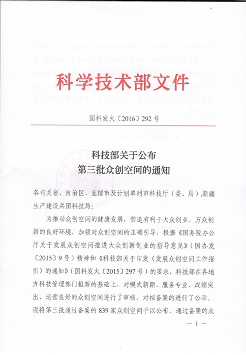 昨日,科技部公布了第三批众创空间名单,公司众创空间顺利通过评估,跻身国家级众创空间之列。据了解,这是根据《国务院办公厅关于发展众创空间推进大众创新创业的指导意见》(国办发[2015]9号)精神和《科技部关于印发<发展众创空间工作指引>的通知》(国科发火[2015]297号)的要求,科技部在各地方科技管理部门推荐的基础上,经第三方评估而评出的。