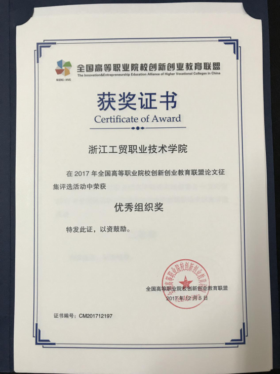 年会上颁发了2017全国高等职业院校创新创业教育联盟年会论文获奖证书。公司获得“优秀组织奖”。林聪伶等老师撰写的《温州市众创空间发展现状、问题及对策研究》论文获一等奖;申珊珊等老师撰写的《“2+1”创业教育试点的现状调查及对策研究——基于m88官网的实践探索》论文获二等奖;林聪伶老师撰写的《浙江省高校毕业生创业现状、问题与对策研究——基于2012届—2015届浙江省高校毕业生职业发展状况及人才培养质量调查报告》论文获二等奖;申珊珊老师撰写的《“2+1”创业班员工的创业意向及其影响因素分析——基于个体特征及家庭特征的研究》论文获优秀奖;张页老师撰写的《高职员工创业指数研究》论文获优秀奖。