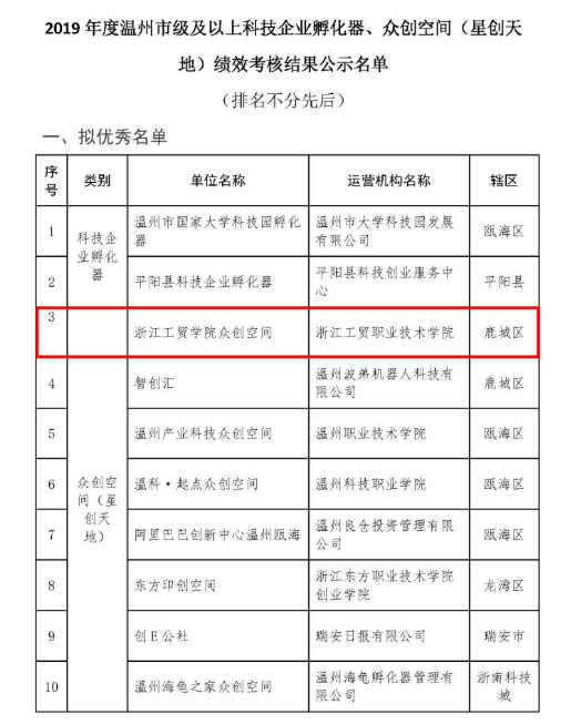 近日,由温州市科技局组织的温州市级及以上科技企业孵化器、众创空间(星创天地)绩效考核工作,经专家网络评审、现场复核和综合评价环节,公司众创空间被评为2019年度温州市优秀众创空间。