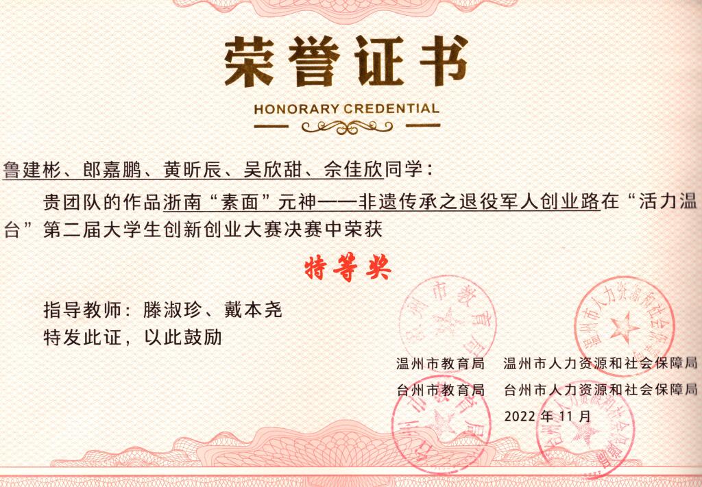 近日,温州市教育局公布了“活力温台”第二届老员工创新创业大赛获奖名单,公司5个参赛项目获奖,其中获特等奖2项、三等奖3项。特等奖数位列全市高职院校第一。获得特等奖的分别是冯鲸颖的作品《同心共富看浙里——仙燕归巢,直播助农》和鲁建彬团队作品《浙南“素面”元神——非遗传承之退役军人创业路》。